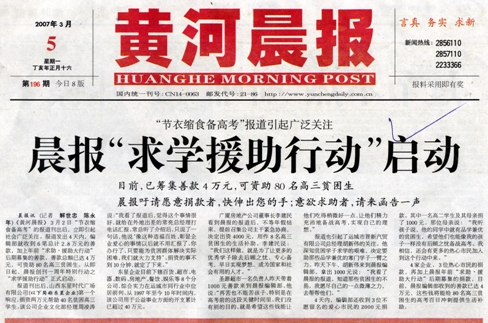 晨報訊(記者謝世忠 陳永年)《黃河晨報》3月2日“節(jié)衣縮食備高考”的報道刊出后,立即引起社會廣泛關注。報道發(fā)出4天內(nèi),編輯部就收到6筆總計2.8萬元的善款,加上年前“求助·援助大行動”后期募集的善款,善款總額已達4萬多元,可資助80名高三貧困生。從即日起,晨報創(chuàng)看一周年特別行動之“求學援助行動”正是啟動。